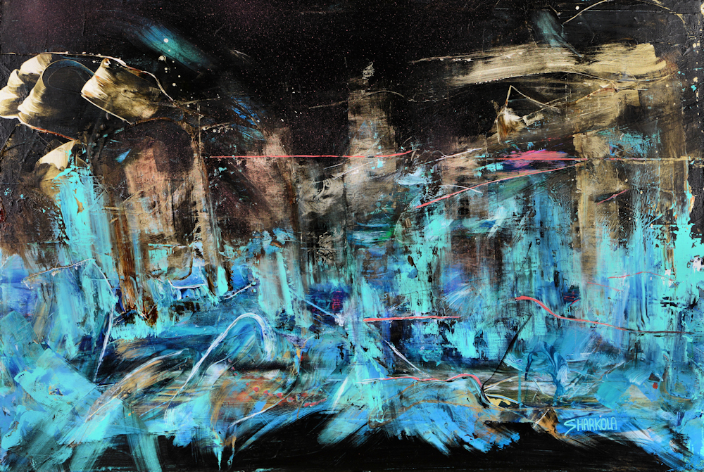 Most of Stephen’s abstracts are created stream of conscious – spontaneous, loose, usually with no particular reference in mind. Something happens when your hands are elbow deep in the paint, you never know what will emerge. Most of the canvases have many different “experiments” underneath, layer upon layer, until something surfaces like a memory. Using brushes, rollers, newspaper, knives, fingers, spray bottles, crazy color pallets – creating a dream world in 2D. Contact the artist directly to purchase originals, large scale Giclées or visit https://www.saatchiart.com/harkola for brokered originals and smaller prints.